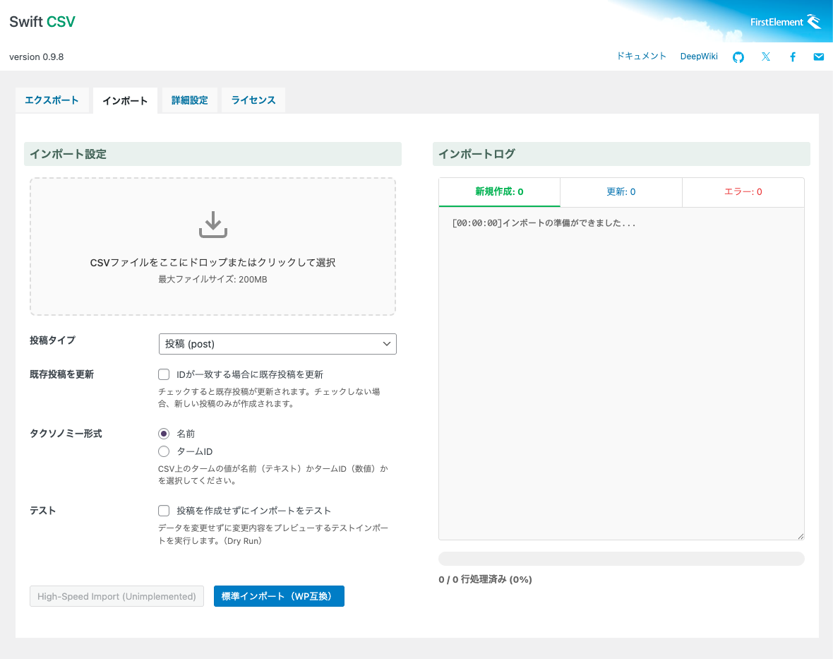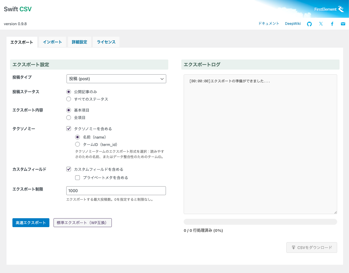 Swift CSV Pro は、WordPressの投稿・固定ページや、商品情報・物件情報・求人情報・コラムなどのカスタム投稿タイプを、CSVで高速にインポート/エクスポートできるプラグインです。